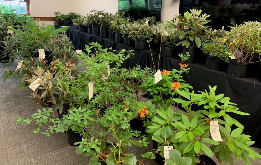 Our Chapter has our biggest flower show (Main Flower Show), on Memorial weekend in May every year, in conjunction with our Plant Sale. This is a formally judged show with ribbons awarded in every class and trophies in many categories. Any person, member or not, can enter. The show is open to the public and is one of the ways we reach out to educate the public. It is always gorgeous – and also serves to demonstrate the wide variety of colors, sizes, shapes, and foliage of rhododendrons and azaleas.